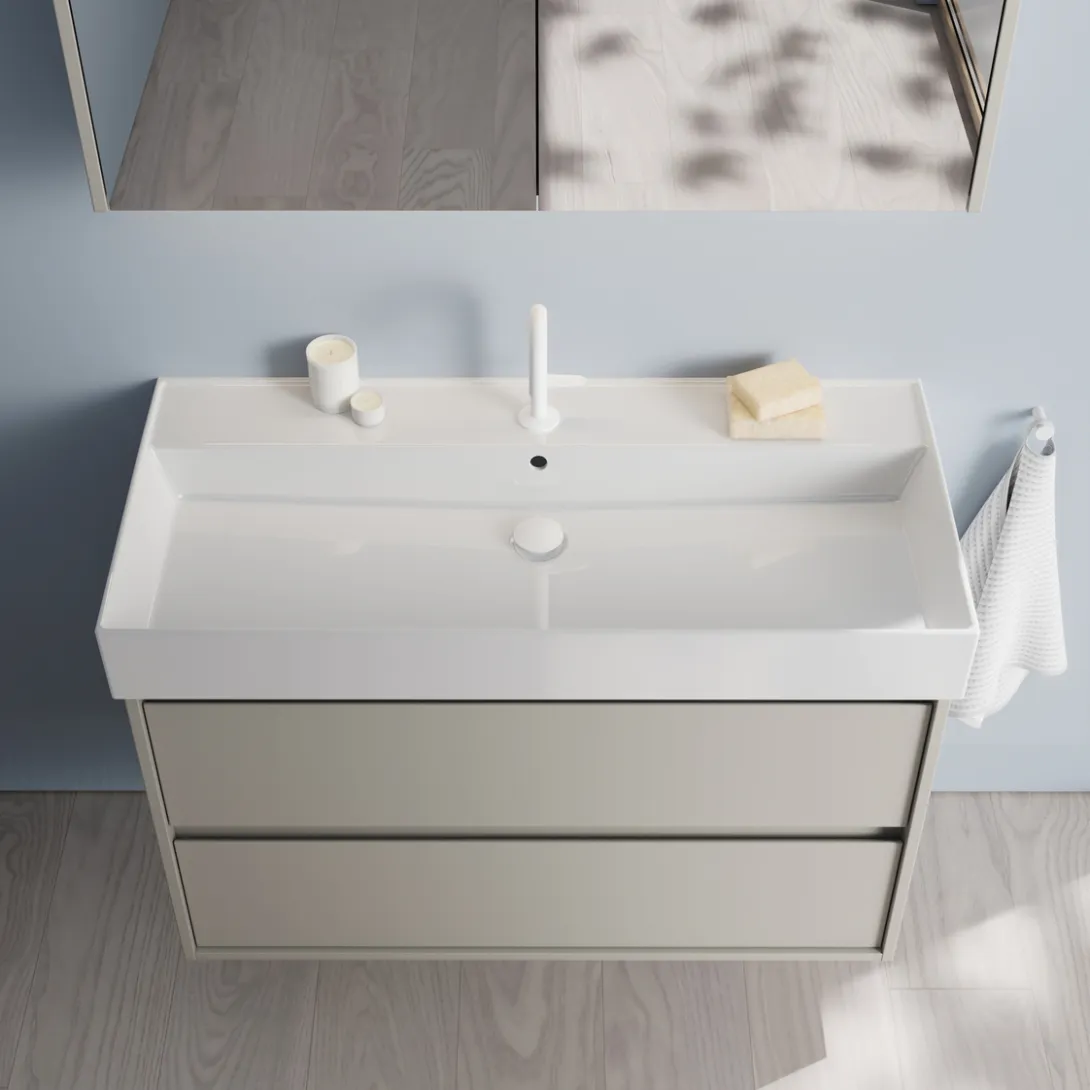 Alle Waschtische sind mit dem cleanFlow-System inklusive Siphon und Abdeckung ausgestattet, was Komfort und einfache Handhabung unterstützt.