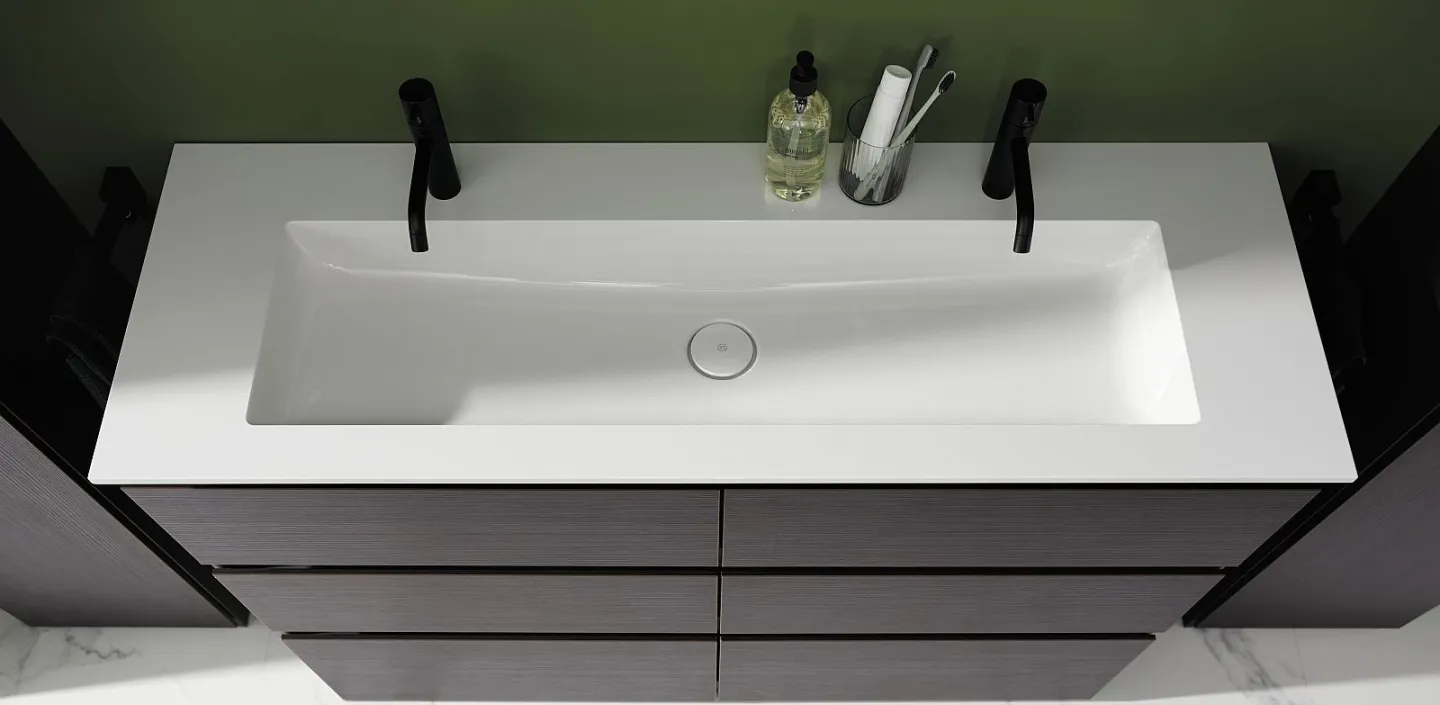 Alle Waschtische zeichnen sich durch eine minimalistische Gestaltung und attraktive Ablageflächen aus. Das gerundete Becken ist je nach Breite asymmetrisch oder zentriert eingelassen. Flächenwaschtische sind mit Doppelbecken oder mit einem großzügigen Einzelbecken verfügbar.