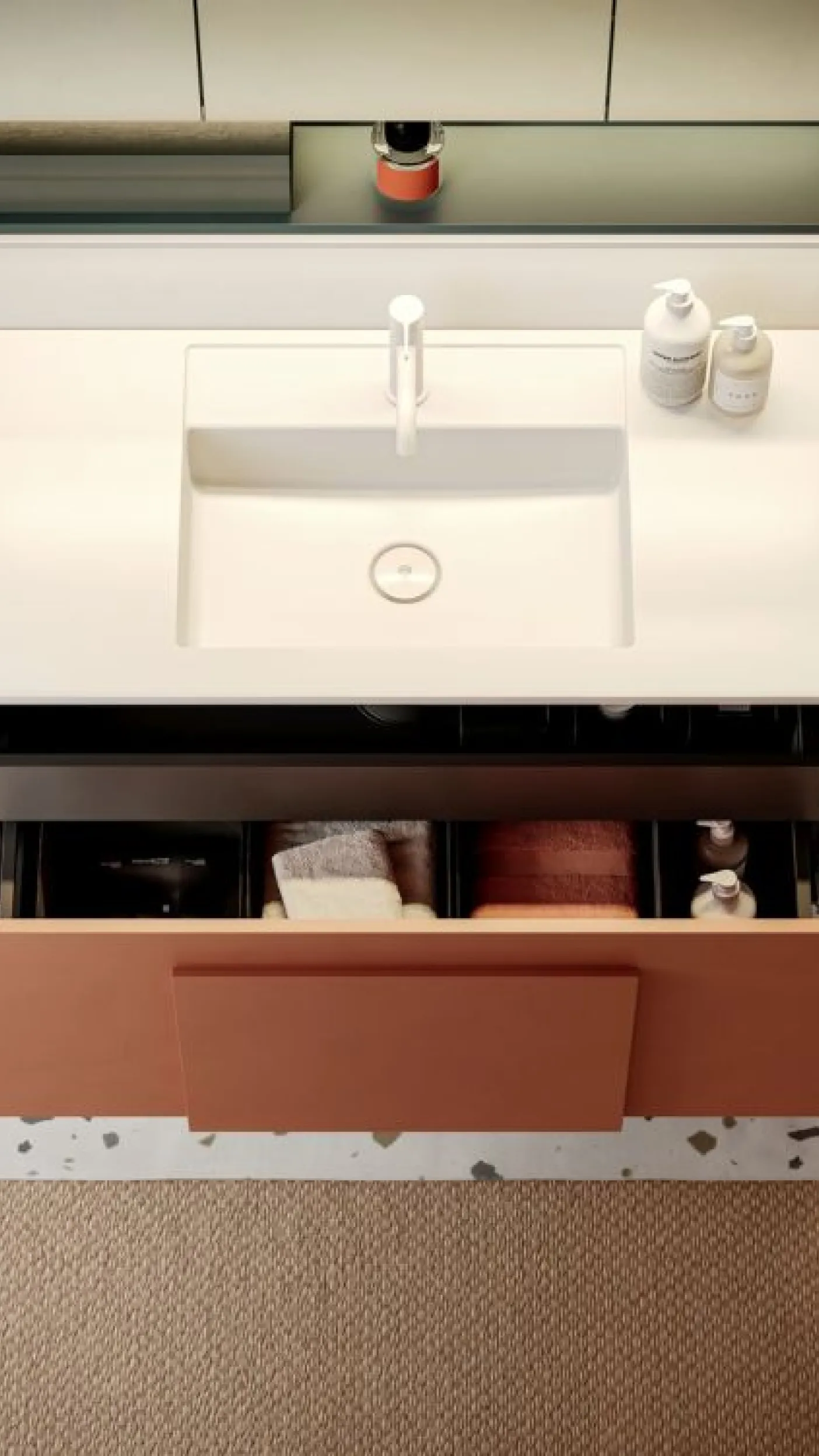 Der dezente Korpus bildet einen feinen Rahmen. Fronten und Becken wirken wie aus einem Guss. Das ergibt eine klare Optik, die lange modern bleibt. Der Rahmen kann in Weiß Matt sein oder in einer der zahlreichen Farben des Farbkonzepts.