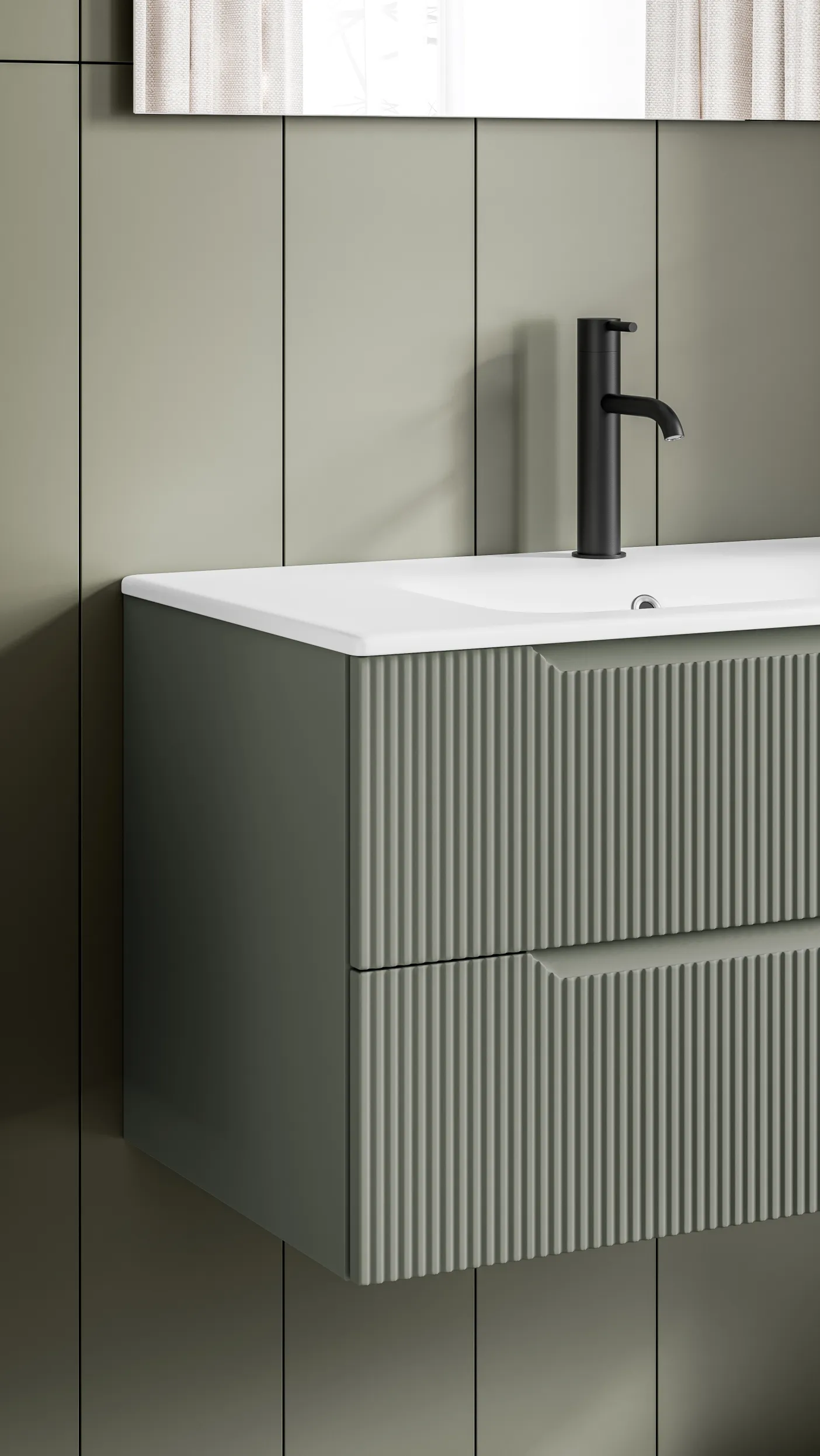 Die Badmöbelserie .Bravo verleiht dem Badezimmer mit seiner markanten geriffelten Frontstruktur und den grafisch integrierten Griffmulden einen einzigartigen Charakter. Eine Serie, die modernes Design mit hoher Alltagstauglichkeit verbindet.